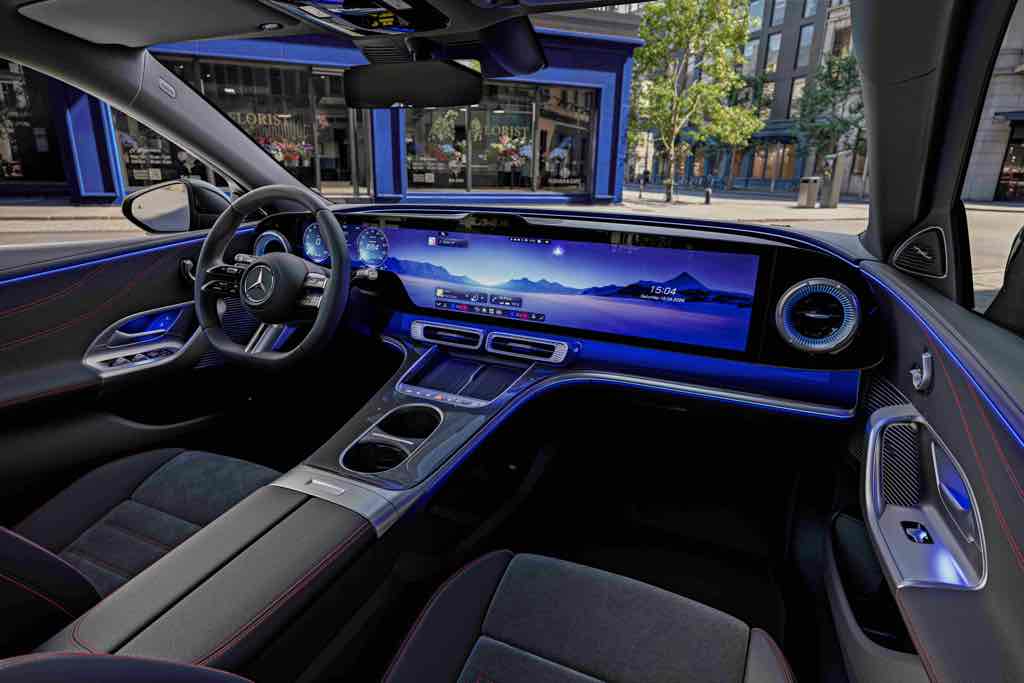 A digitális és analóg dizájn tökéletes harmóniában jelenik meg az utastérben. A központi elem a MBUX Hyperscreen, amely a műszerfaltól a másik oldalig húzódva egyetlen egységes felületet alkot.