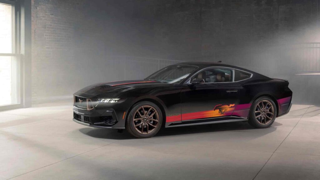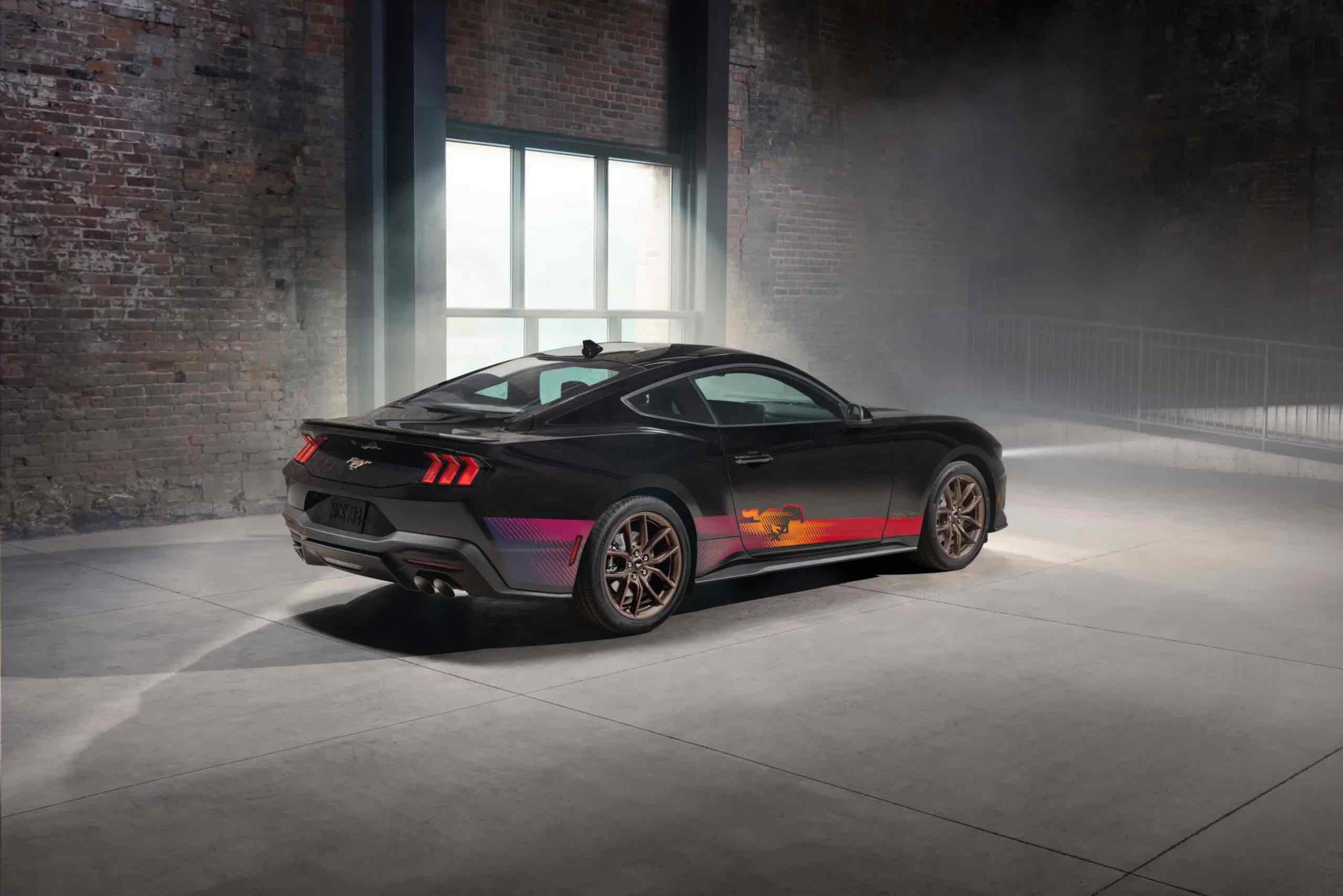 Az új különkiadás egyik legfontosabb sajátossága, hogy kizárólag fekete fényezéssel rendelhető. Erre az alapra kerülnek fel a Troy Lee Designs által tervezett élénk vörös, narancs, lila és sárga oldalsó grafikák, amelyek a Mustang emblémáját is integrálják a mintázatba. A kontraszt szándékosan erős: a sötét karosszérián a színes elemek már messziről is felismerhetővé teszik az autót.