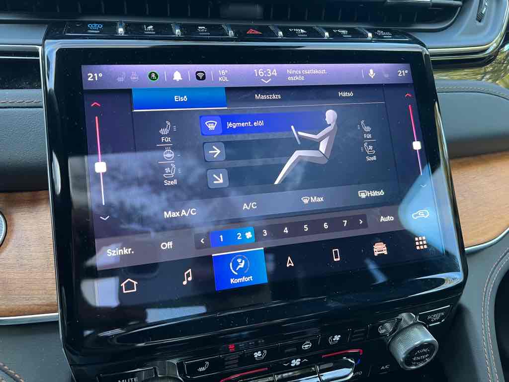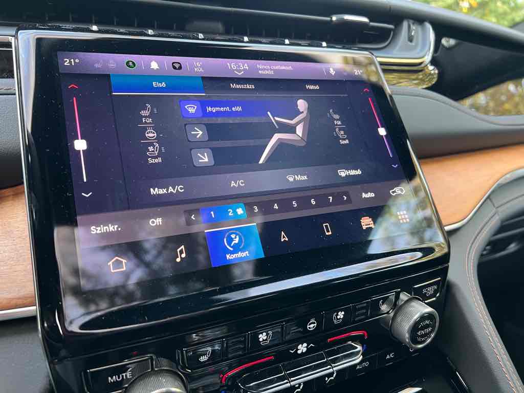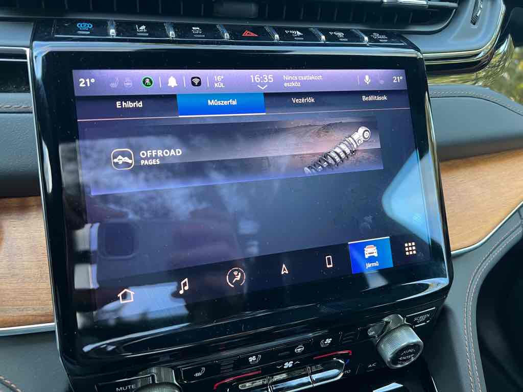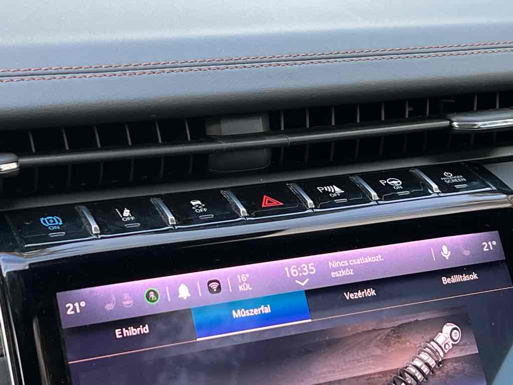 A Grand Cherokee 4xe kifejezetten csendes, EV módban hangtalanul suhan, rugózása kiváló, országúton és városban is kényelmet kínál. A felfüggesztés megfelelően csillapítja az úthibákat, az ülések kényelmesek még hosszú távon is.