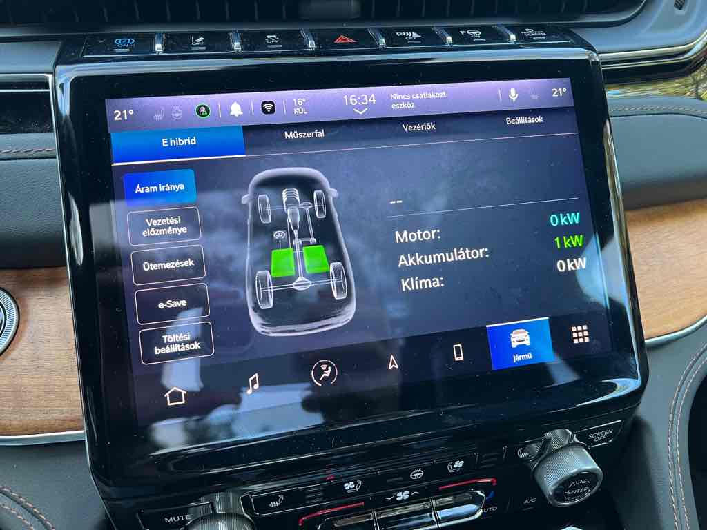 A plug-in hibrid rendszerrel kombinált Grand Cherokee a városban és rövid utakon különösen takarékos – méroseink szerint nagyjából 47,5 kWh/100 km elektromos fogyasztással, teljes tölthetőség mellett akár 48 km-t is megtehetünk tisztán elektromosan.