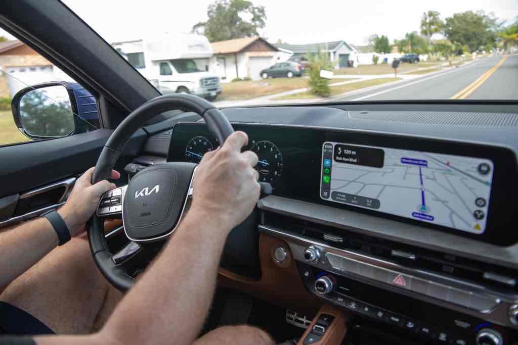 A teszt Kissimmee-ben zárult, ahol tipikus amerikai külvárosi környezetben, szűkebb utcákon, bevásárlóközpontok parkolóiban és családi házas negyedekben mozogtunk. A meglepően jó fordulókör, a kamerarendszer és az elöl elhelyezett “orralátó” nézet egy ekkora autót is könnyen kezelhetővé tesz.